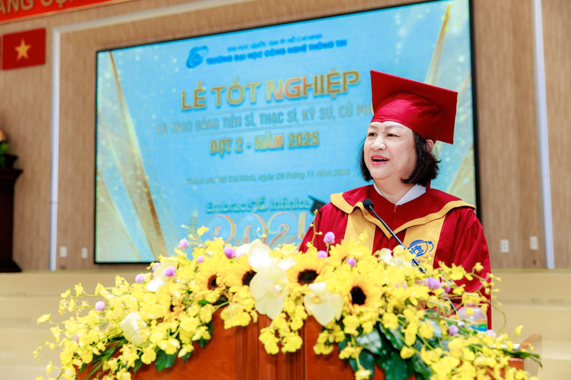 “Các bạn thân mến, trong bối cảnh hội nhập quốc tế, cách mạng AI, đây là thời điểm để các bạn chứng minh thực sự năng lực của mình, trở thành những người con có ích hơn nữa cho xã hội, cho gia đình, và thành công của các bạn trên đường đời là niềm vui, sự mong đợi của các thầy cô viên chức, cựu sinh viên của trường ta. Kể từ hôm nay các bạn bước sang một trang mới nhưng chưa phải là thời điểm kết thúc việc học, hy vọng rằng với những kiến thức và kỹ năng tiếp thu ở trường, các bạn sẽ tiếp tục nỗ lực học tập, tự học hằng ngày và để vươn lên một tương lai sáng lạn đang chờ ta ở phía trước”.