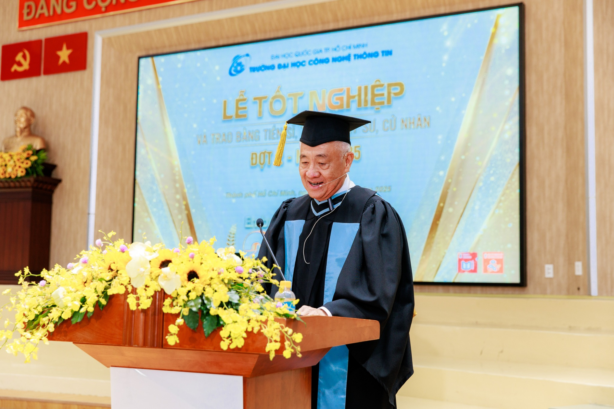 Đặc biệt, trong Lễ tốt nghiệp đợt 2 năm 2025, Trường Đại học Công nghệ Thông tin đón chào diễn giả TS. Nguyễn Thanh Mỹ - một doanh nhân, nhà sáng chế, nhà khoa học sở hữu hàng loạt bằng sáng chế quốc tế, là biểu tượng của sáng tạo, đổi mới và truyền lửa. Với chủ đề “Tốt nghiệp không phải đích đến, đó là khởi điểm của hành trình tự lập trình cuộc đời”, diễn giả đã truyền cảm hứng mạnh mẽ đến người trẻ với các nội dung: nhận diện “fear virus, mind virus, digital dopamine” - những rào cản vô hình của thời đại số, lan tỏa tinh thần tử tế, trách nhiệm và tích cực trong hành trình lập nghiệp; Gợi mở tư duy hướng về tương lai bằng “trái tim nóng” và “cái đầu sáng suốt”.