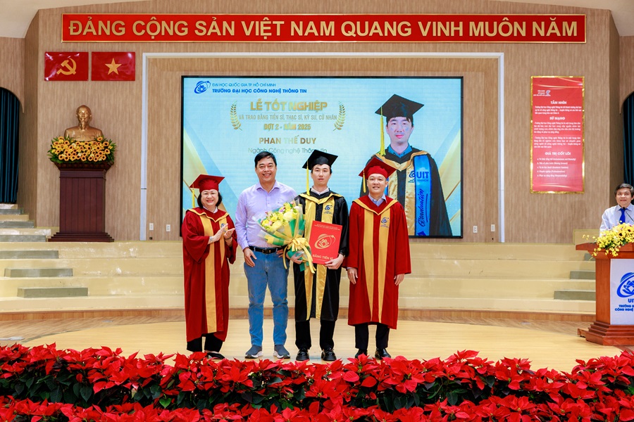 Phát biểu tại buổi lễ, Tân Tiến sĩ Phan Thế Duy chia sẻ “Nhìn lại chặng đường đã qua, tôi nhận ra rằng điều quý giá nhất UIT trao cho tôi không chỉ là tri thức hay là phương pháp tư duy, UIT trao cho tôi một điều âm thầm hơn, bền bỉ hơn, một sợi dây vô hình kết nối tôi với những con người đã đi bên cạnh mình, giúp tôi học cách nhìn thấy và trân trọng hơn một phần không thể thiếu trong hành trình trưởng thành của mình. UIT dạy tôi rằng mỗi bước trưởng thành dù nhỏ đến đâu đều có dấu chân đồng hành, nâng đỡ, hy sinh của những người khác. UIT cũng giúp tôi hiểu rằng sự tử tế và kiên nhẫn đôi khi chính là lá chắn phòng thủ vững vàng nhất để ta không chùn bước thử thách”.