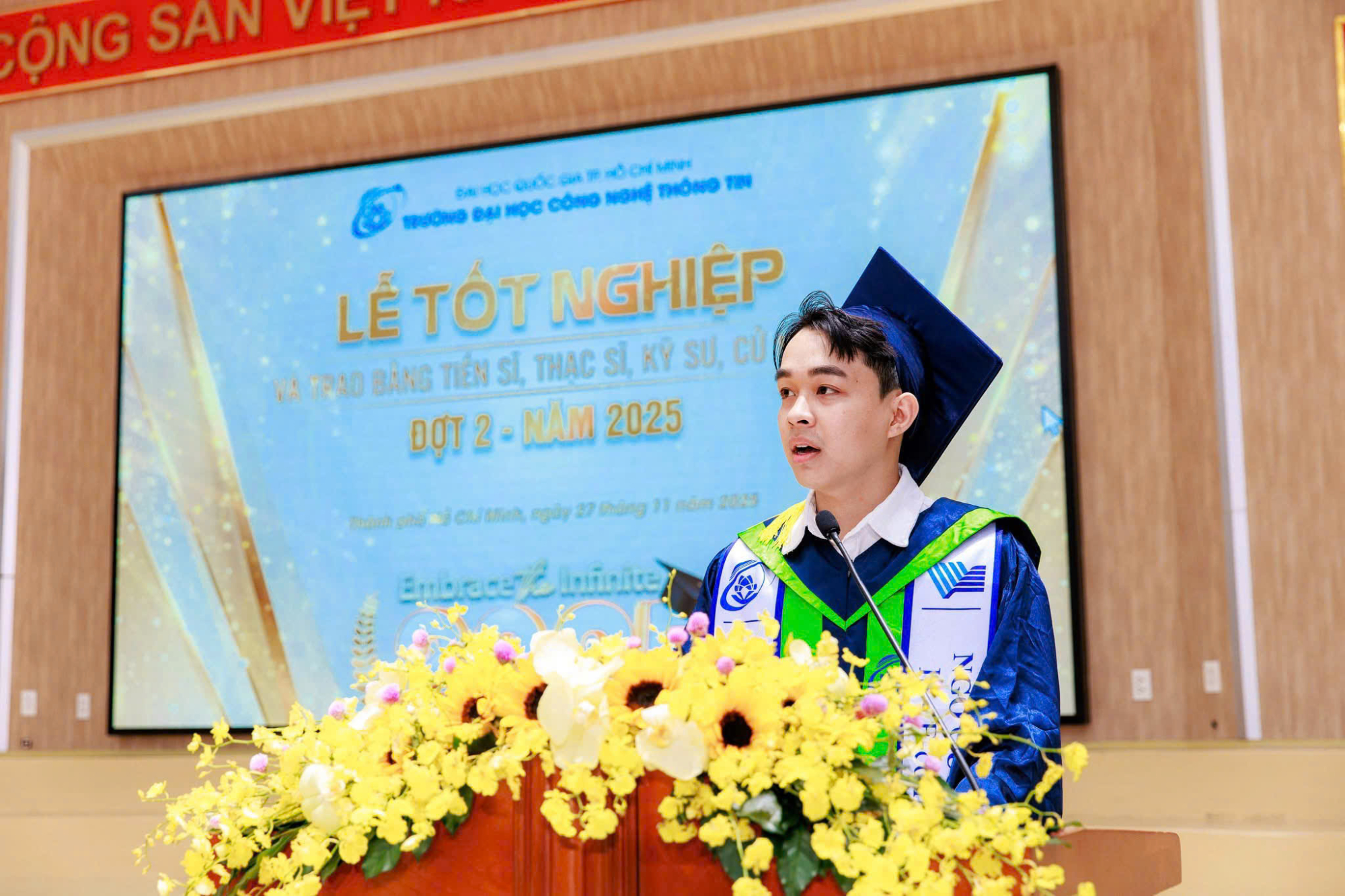 Quốc Huy đại diện sinh viên phát biểu tại Lễ tốt nghiệp đợt 2 năm 2025