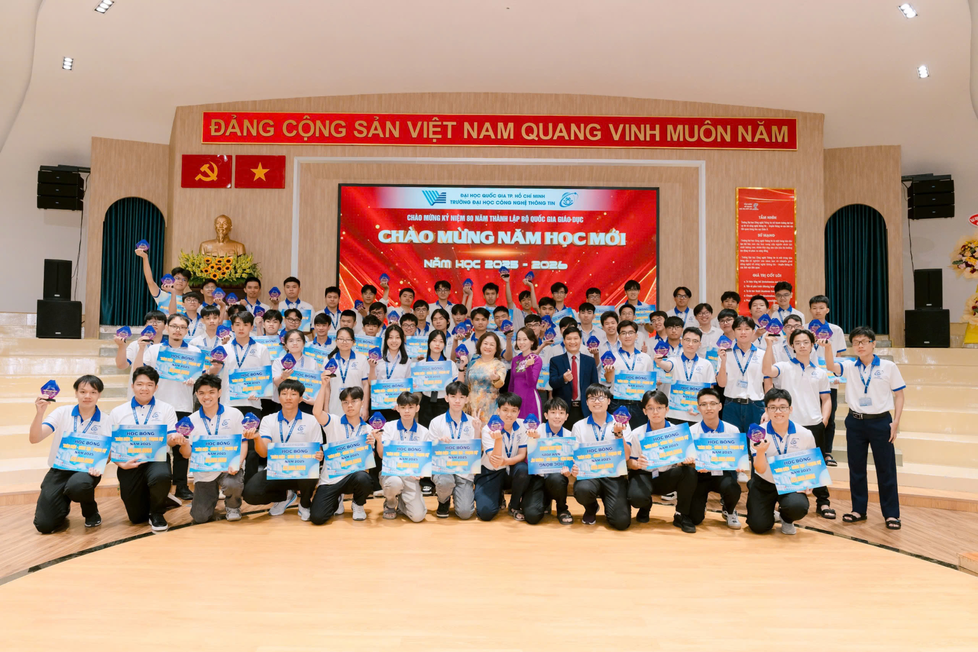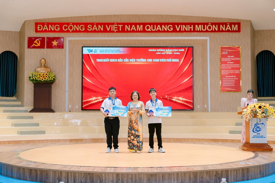 Cũng trong buổi lễ khai giảng, Trường Đại học Công nghệ Thông tin đã vinh danh 2 tân sinh viên xuất sắc đạt danh hiệu Thủ khoa trong kỳ thi Tuyển sinh đại học năm 2025. Sinh viên Hồ Tuấn Khôi - Thủ khoa phương thức xét tuyển kết quả thi ĐGNL 2025 với số điểm 1108 điểm và sinh viên Trương Minh Quân - Thủ khoa phương thức xét tuyển kết quả thi Tốt nghiệp THPT 2025 tổ hợp A00 với 29,25 điểm.