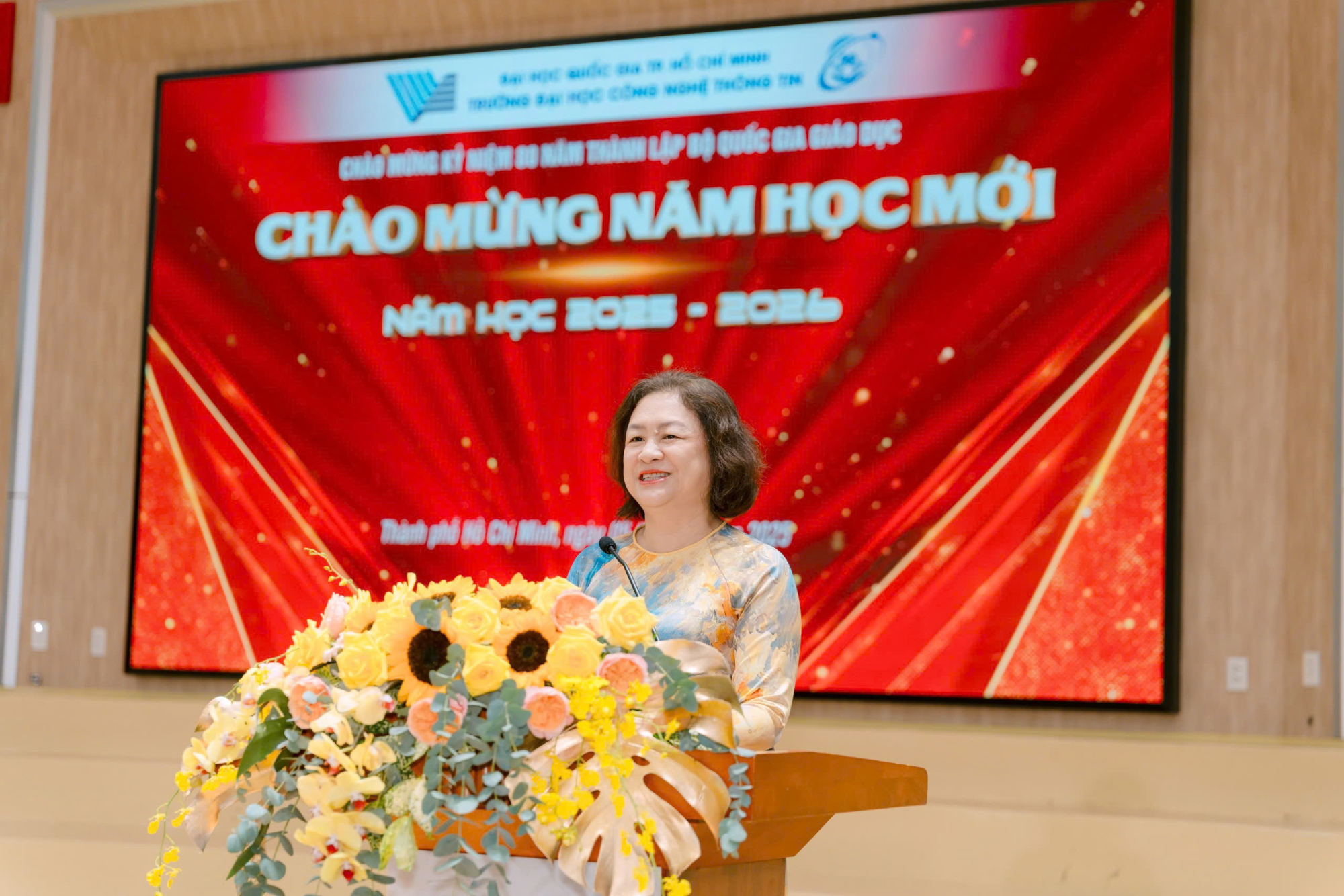 Cùng với đó, cô dặn dò các tân sinh viên: Để đạt được thành công, chúng ta cần đặt ra mục tiêu và đầu tư cho nó ngay và luôn như xây dựng một vài kế hoạch cho bản thân và kiên trì thực hiện; đầu tư nền tảng kiến thức chuyên môn vững chắc, làm chủ công nghệ và trau dồi và kỹ năng mềm; thành thạo một hoặc nhiều ngoại ngữ để hòa nhập, tiếp cận với những công nghệ, xu hướng mới nhất; xây dựng các mạng lưới quan hệ; đầu tư cho sức khỏe. “Cô tin rằng ngôi trường UIT thân yêu này sẽ là những năm tháng đẹp nhất, đáng nhớ nhất của các em. Hãy cùng nhau phấn đấu trong học tập, rèn luyện và không ngại đối mặt với khó khăn để khẳng định chính mình. Đây là lúc để các em trở thành những sinh viên bản lĩnh, sáng tạo và tự tin hội nhập thế giới”.
